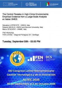 Il 30 settembre 2025 il Professor Roberto Mavilia ha presentato il paper “The Control Paradox in High-Crime Environments: Empirical Evidence from Italian SMEs”, realizzato insieme al Professor Salvatore Loprevite e al Dott. Marco Spadaro, alla ALTEC Chile 2025 Conference, tenutasi a Santiago. Ha mostrato come il crimine organizzato influenzi la corporate governance e i sistemi di controllo interno delle piccole e medie imprese italiane mostrando che, paradossalmente, le imprese che operano in aree con una forte presenza della criminalità tendono ad avere sistemi di controllo più deboli.